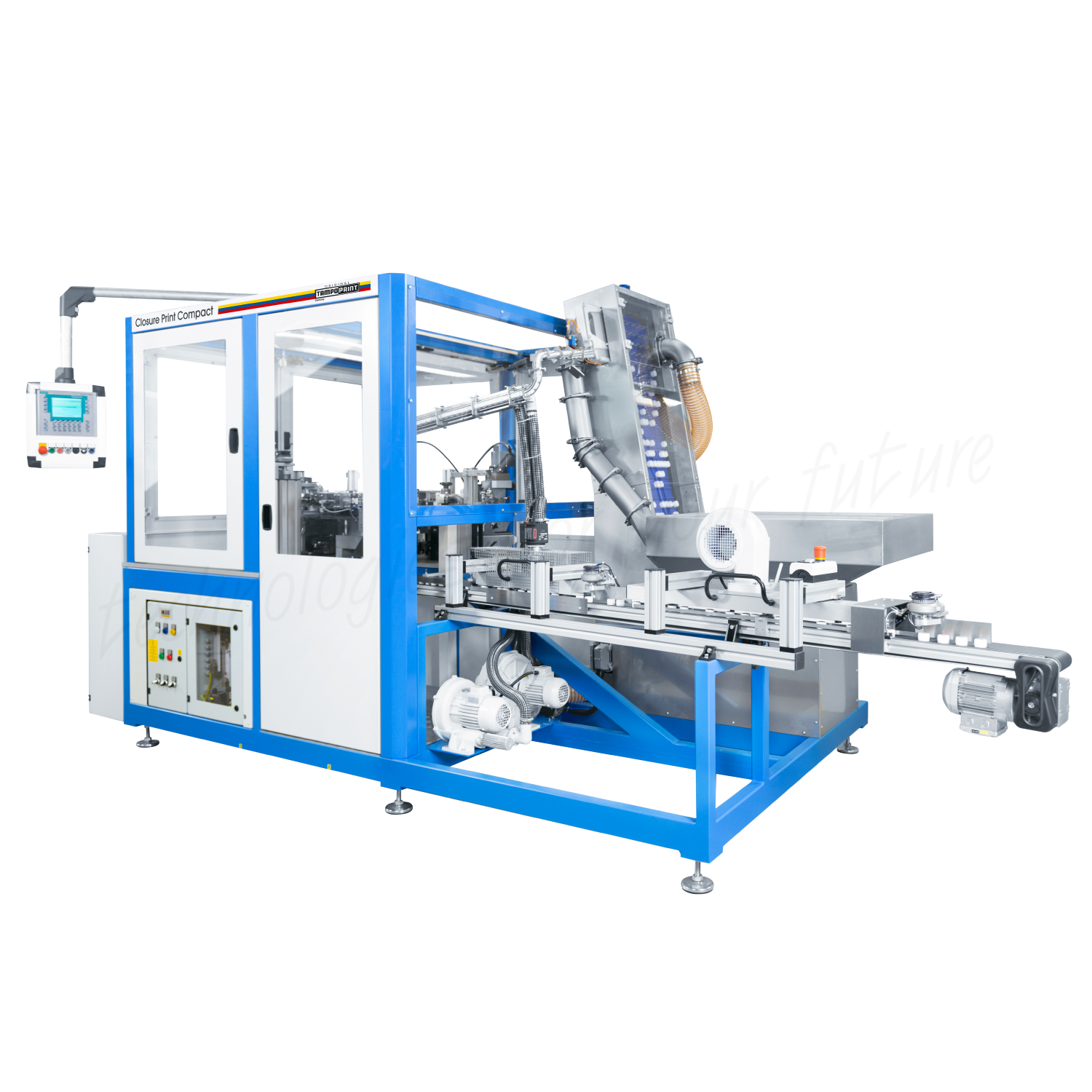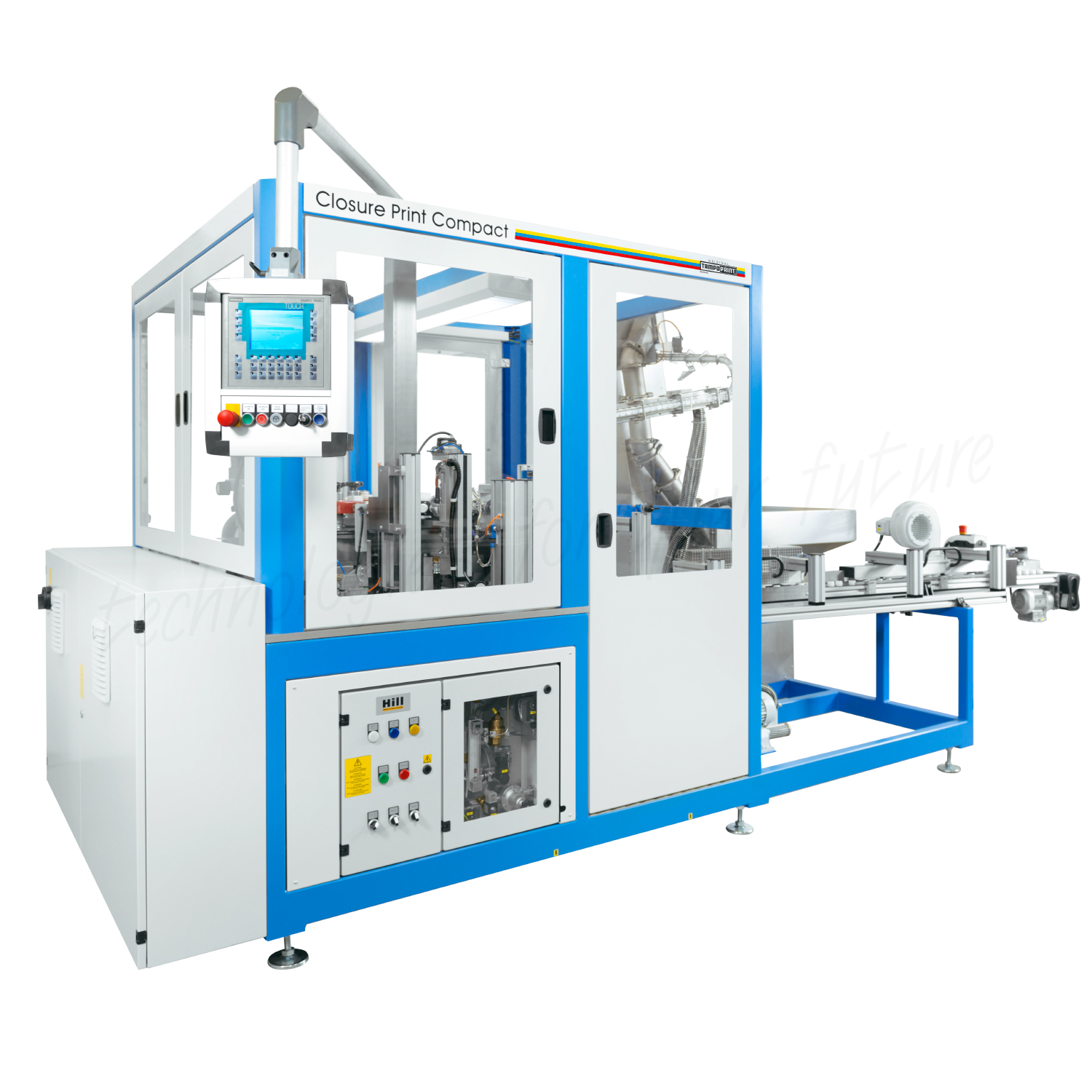 CLOSURE PRINT COMPACT er et fuldautomatisk, stabilt roterende system designet til små til mellemstore serier af tryk på lukningskapsler. Med op til tre farver og et højpræcist roterende cylinder system kan den producere op til 45.000 lukningskapsler i timen. Plug-and-play-installationen sikrer hurtig opsætning, mens funktioner som laserfremstillede klichécylindre og specialtilpassede tamponruller optimerer trykkvaliteten.