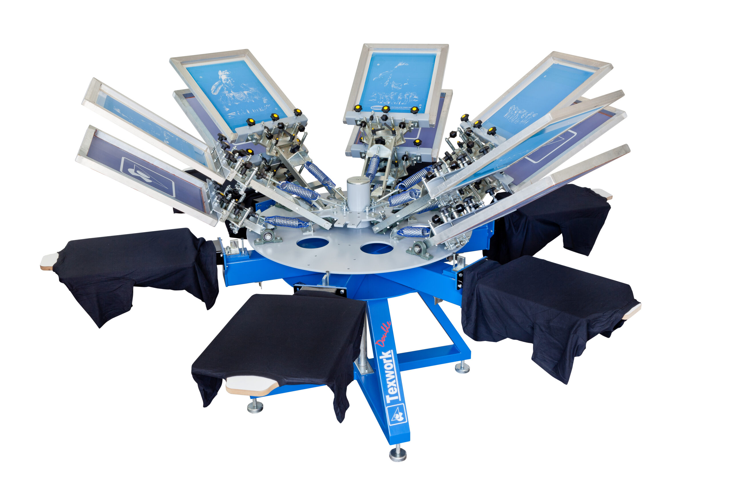 Texwork Double er en manuel tekstiltrykskarusel med et dobbelt farvedæk, der giver høj farvekapacitet på begrænset plads. Den har uafhængig rotation af rammer og paletter, individuelle mikroregistreringer samt værktøjsfri justering af rammeløft. Med justerbar paletpositionering, stabil konstruktion og kompatibilitet med forskellige specialpaletter er den ideel til tryk på kasketter, paraplyer, jakker, ærmer, transfers og meget mere.